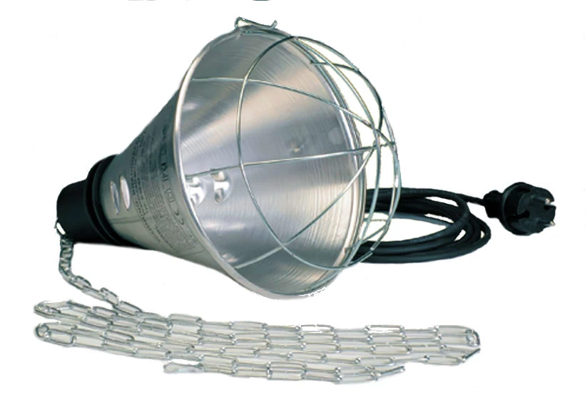 mit Metallschirm, 2m langer Kette und Karabinerhaken. Fassung E 27, Anschlussleitung 2,50m lang. Tropfwasser geschützt und schutzisoliert. Dank des Sparschalters lässt sich die Leistung und der Verbrauch um 50% reduzieren.